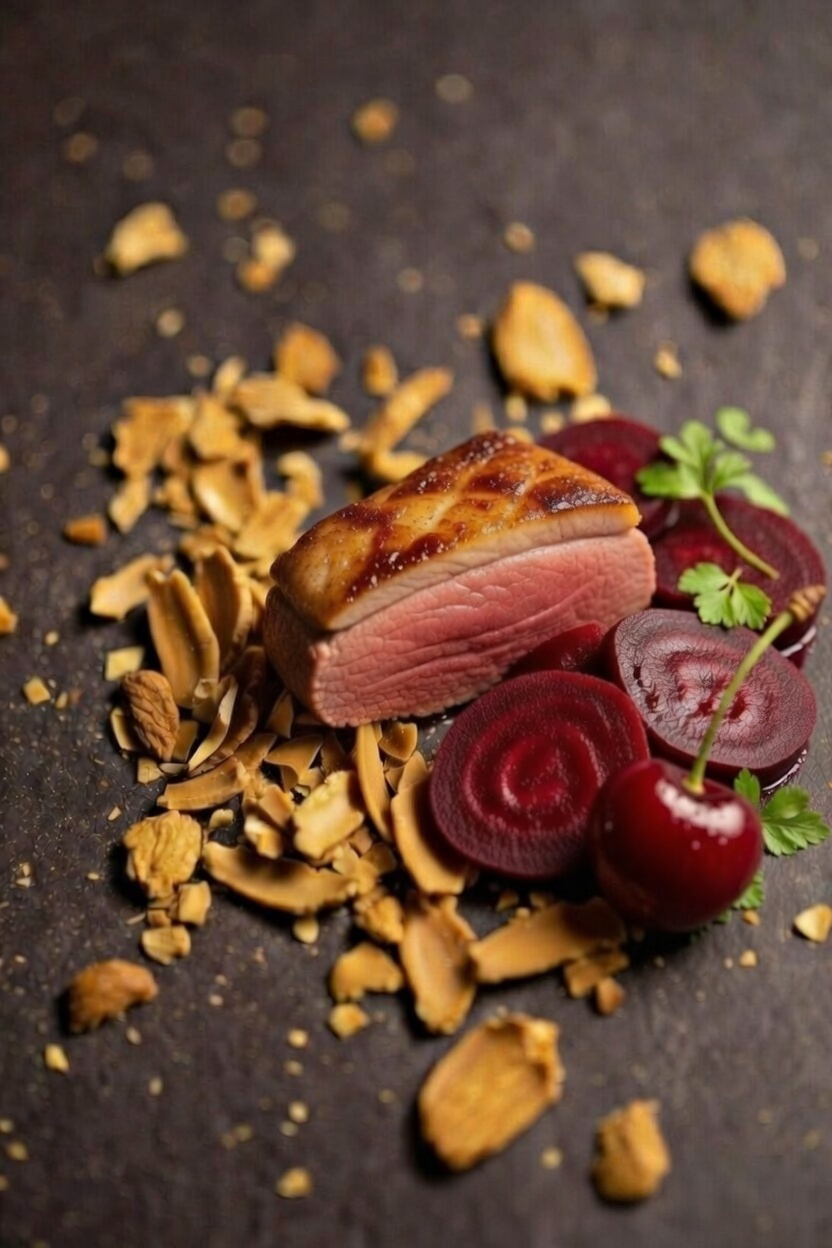 kachní prso, červená řepa, kompotované nebo čerstvé višně, kachní jus (nebo demi glace), višnovice, máslo, pražené mandle, listy červené řepy, tymián, sůl, pepř