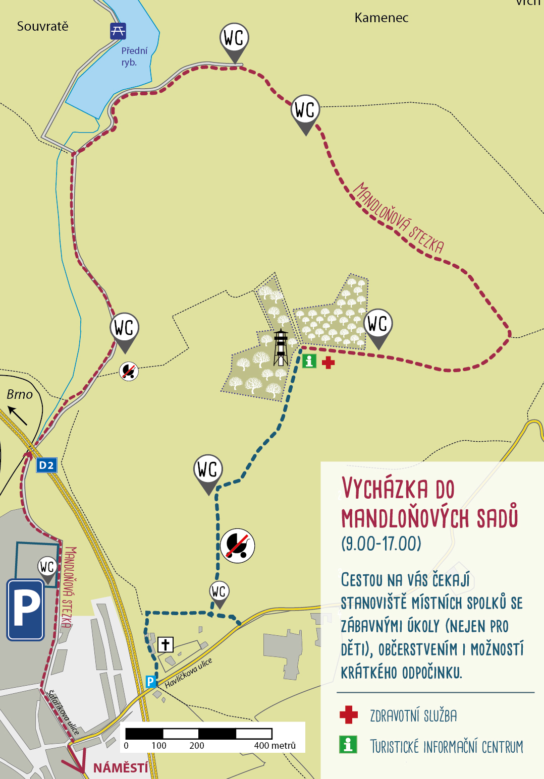 Po oba dva dny si můžete přímo v sadech v časech 10:30, 12:00 a 14:30 poslechnout povídání o historii i současnosti mandloňových sadů.